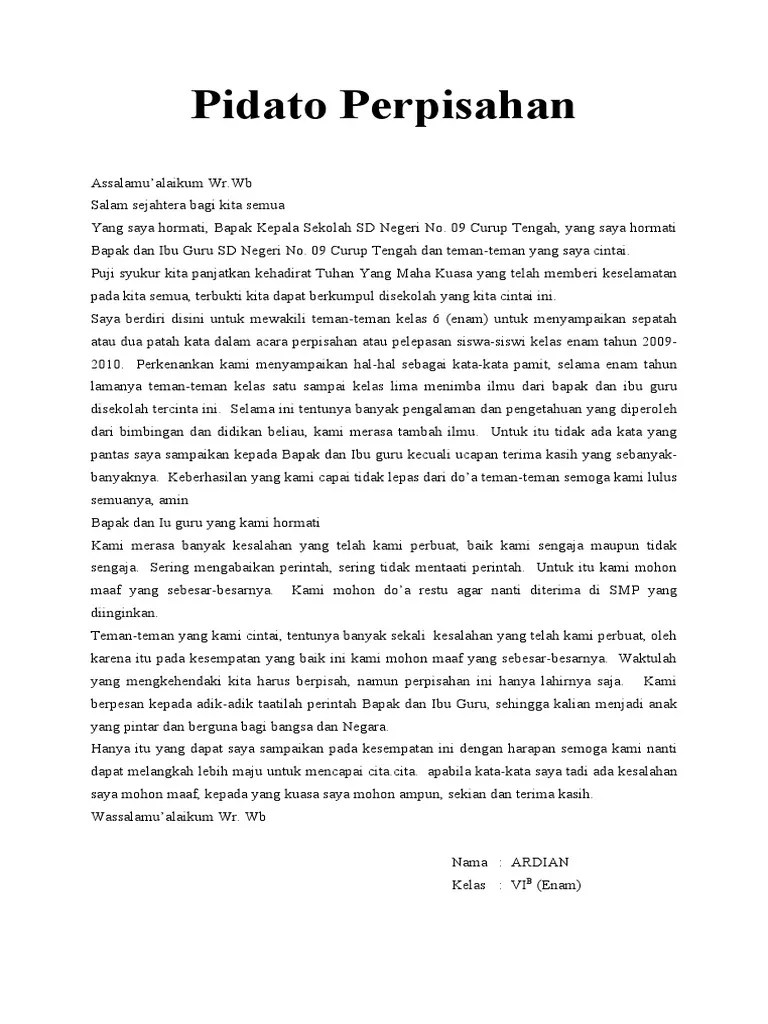 Panjenenganipun bapak kepala sekolah ingkang dahat kinurmatan, bapak/ibu guru ingkang kulo kurmati, ugi para kanca siswa siswi smkn 1 temanggung ingkang kula tresnani. pidato perpisahan dalam contoh kali ini terdiri dari teks naskah pidato yang berisi kata kata perpisahan sekolah sd smp sma atau kelas 6 9 12 dan perpisahan dalam acara wisuda sarjana. perpisahan guru sahabat pasangan adalah hal yang sangat tidak diinginkan oleh semua orang. Yang kami muliakan pengasuh pondok pesantren daar el qolam. contoh teks pidato perpisahan kelas 9 smp pidato ialah sebuah kegiatan menyampaikan suatu gagasan ide pendapat dan lain sebagainya dalam bentuk lisan dan disampaikan kepada khalayak ramai dengan komunikasi satu arah.